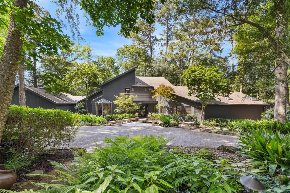 A true architectural standout, this striking modern residence sits on over five wooded acres in a prestigious community—less than one hour from downtown Houston. Three-story, floor-to-ceiling windows flood the expansive open-concept interior with natural light, highlighting soaring ceilings, clean lines, and refined finishes. The layout includes a luxurious primary suite, two secondary bedrooms with ensuite bath, office/loft space (can be 3rd bedroom), a music room/library, flex space, utility area, and abundant storage. Step outside to enjoy resort-style amenities including a custom-designed pool with water wall, fire pit lounge, gated dog run, and a fully fenced utility area. The home is also equipped with a whole-house generator, 3 wood-burning fireplaces, and lush, meticulously maintained landscaping that provides exceptional privacy. A rare fusion of architectural sophistication and natural beauty, this extraordinary property offers elegant living in a peaceful, wooded setting.