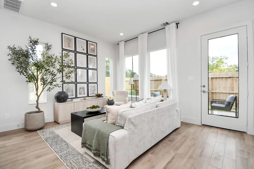 Welcome to Antigua, a private gated enclave located just outside the city's bustling inner loop. This community boasts a sophisticated open-concept design featuring two living spaces: a welcoming first-floor living room and a versatile second-floor flex space. The home is well-appointed with three bedrooms, 2.5 baths, and a luxurious primary suite complete with a spa-like bathroom, stand-up shower, and free-standing tub. High ceilings and abundant natural light enhance the elegant interior, complemented by quartz countertops, under-cabinet lighting, and sleek European-style cabinets in the kitchen. The large island provides ample space for cooking and gathering. Step outside to enjoy tranquil waterfront sounds on the walking trail or simply unwind in your serene outdoor space. Experience the perfect blend of comfort and modern luxury at Antigua. Visit our sales office: 4018 Runaway Beach Ln, Houston, TX 77045