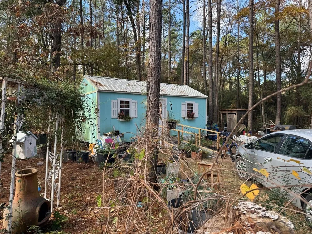 Tiny House in the County. No HOA. Open concept home with shiplapped interior. Includes a 24 foot shipping container for storage. Also storage shed for more storage. Dobbin - Plantersville Coop public water is the supplier for the house. Entergy is the electric power company. For cooking a hot plate is used. Trees and other plants adorn the property.